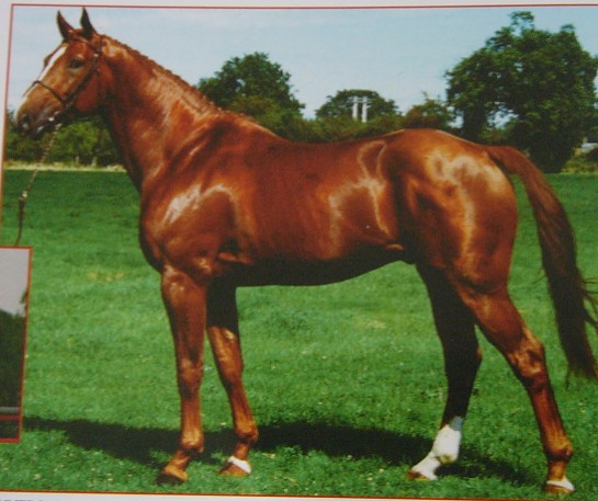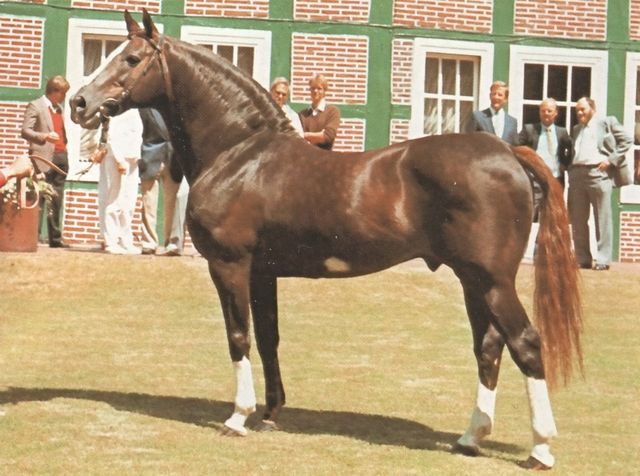 FURIOSO II (1965 – 1986) Such a stallion is born only once every hundred years! exclaimed the man who discovered Furioso II, Georg Vorwerk, when he first saw the dark chestnut on a tour to France. Furioso II is one of the most influential sires in sport horse history. His offspring have performed well in all disciplines of show jumping, including at the Barcelona and Sydney Olympics. Known as the “Stamp Stallion”, because his offspring inherited his ‘very good feet and legs, his outstanding neck and shoulder, striking dappled chocolate chestnut coat with flaxen tail and white markings’, Furioso II was later approved for the Hanoverian, Rhineland, and Westphalian studbooks.