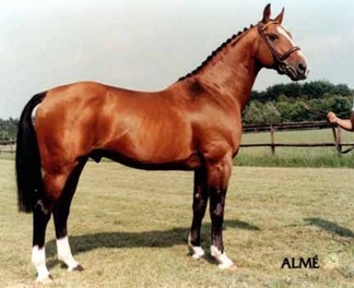 ALME Z (by Ibrahim) was an International show-jumper. “Today Almé is the only stallion in the World to have fathered two World Champions and three Olympic horses. During the Eighties an Olympic team could have been made up of his sons alone. Only Furioso could have done that in the sixties. In 1991 Jalisco may hope to do as much, being a product of both Furioso and Almé.” “The only horse with a comparable family tree and with whom he has often been compared is Northern Dancer. Almé’s legacy is already assured by the extraordinary quality of his sons, already working stallions, and will gain from the arrival on the sports field his five new generations.”